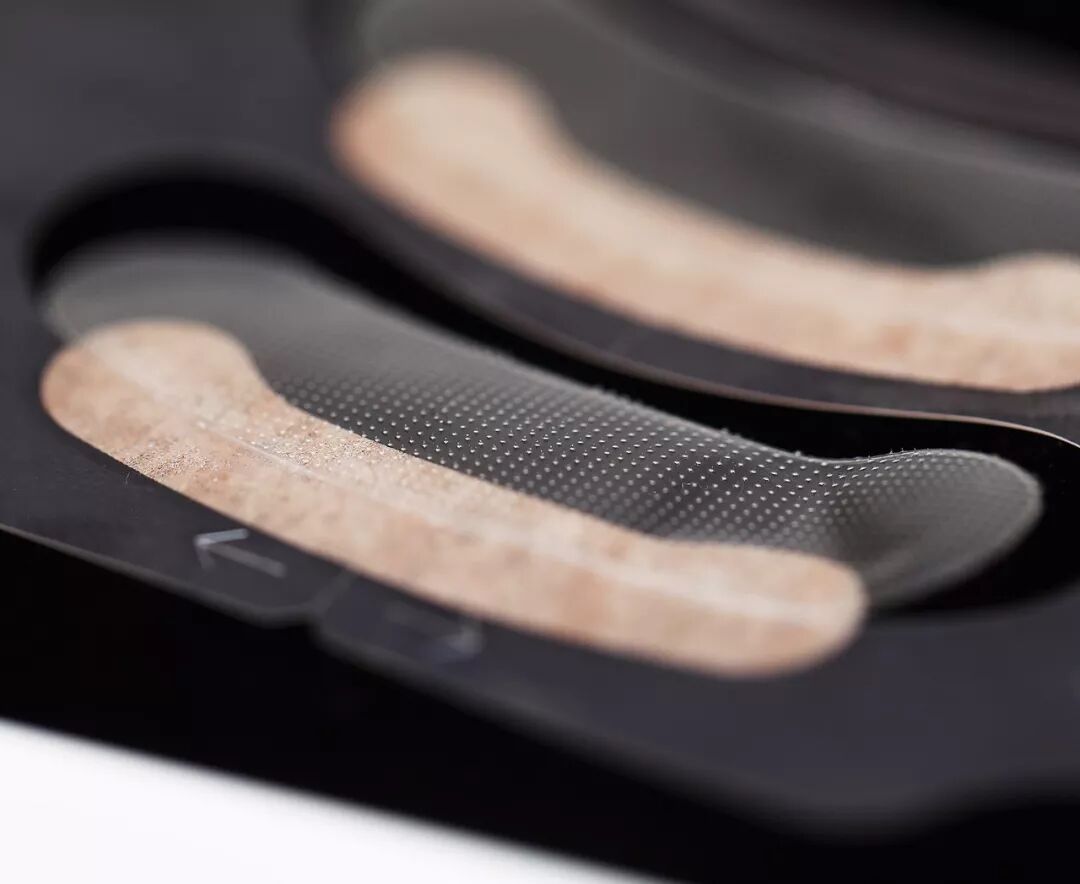 微针眼贴膜,不要用手胡乱去摸,可能会损伤微针。摸摸胶带,黏的一边,就是往脸上贴的一边。▼
