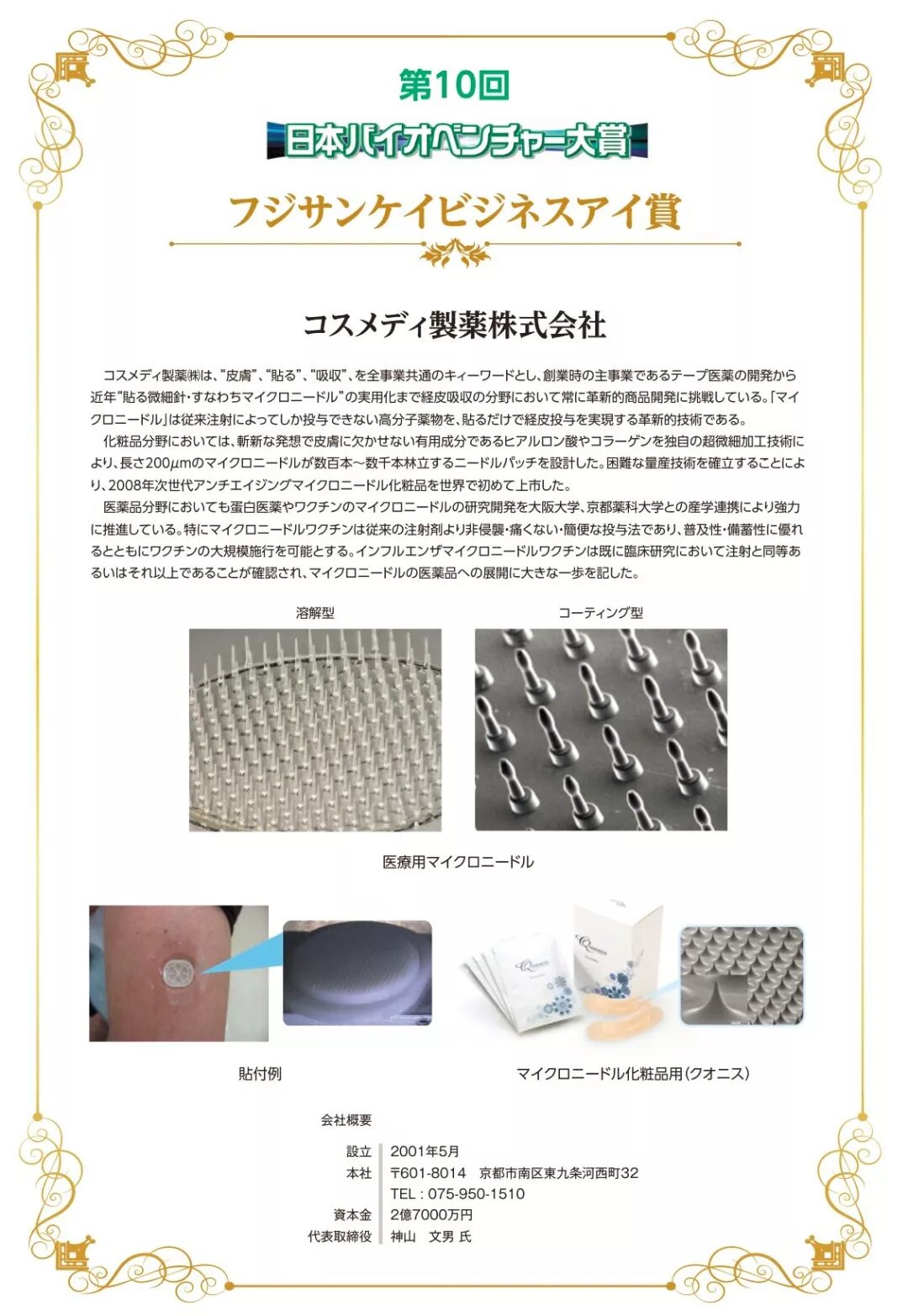 技术研发则由日本京都药科大学神山文男教授研究团队打造,使用的玻尿酸可溶微针「透皮给药」技术,获得过大高博幸赏,京都技术大赏等多个奖项。