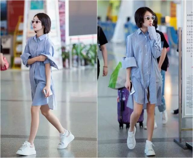 最近风头正劲的鬼马精灵周冬雨选择用oversize衬衫裙搭配oversize sneaker,蓝白配色清爽又活泼,时尚设计感更强。