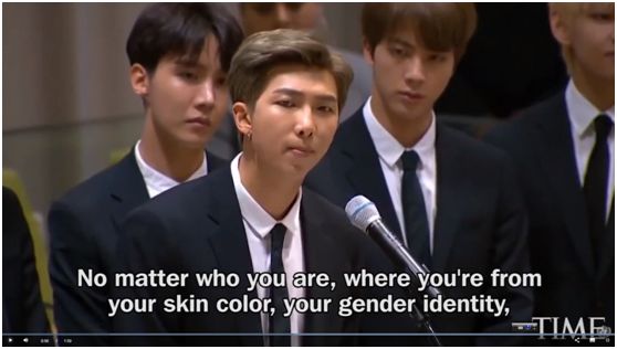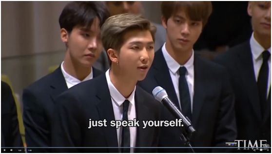 坚持韩语演唱是一回事,在国际讲台,金南俊的英语演讲十分流利。他在演讲中表示:“不论你是谁、来自何方、你的肤色、你的性取向,大胆说出你自己。”