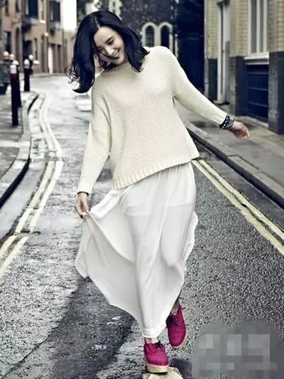 毛衣和长裙的搭配,甜美的气质尽显,红色的鞋子给整个搭配加了不少分。