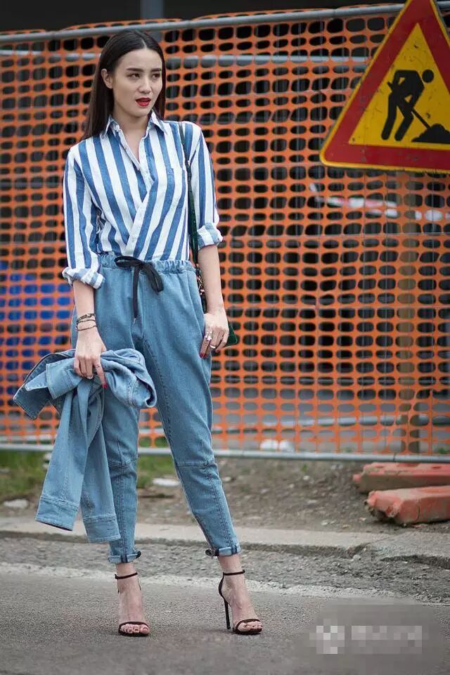 一件条纹衬衫和一条小脚裤,与以往相比多了那么几分帅气与随性,攻气十足,完全成为了霸道女总裁。