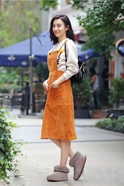 亮丽的背带裙加上一双毛茸茸的小短靴,怎么看都觉得很可爱。