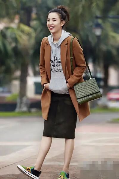 帆布鞋似乎是减龄神器,配上卫衣和小短裙一起穿的话,瞬间年轻了十岁有木有。丸子头更是一个小小亮点。