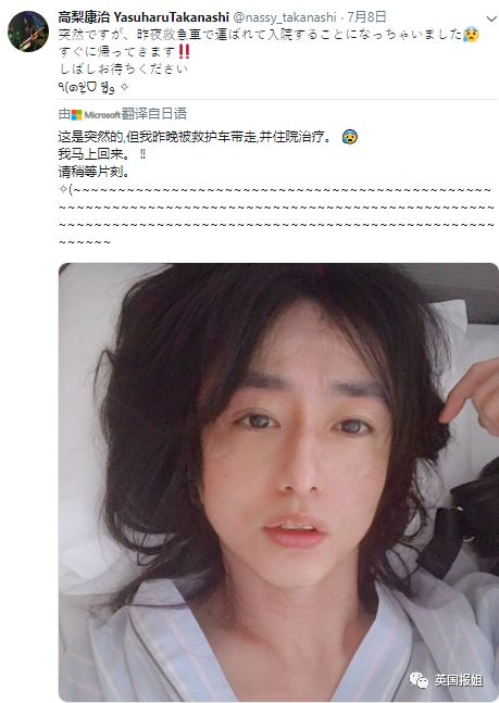 7月8日,日本56岁的知名作曲家高梨康治发了张自拍,配文是自己突发疾病,被救护车拉走然后住院了。