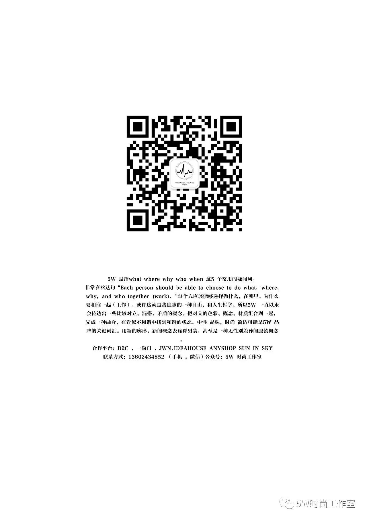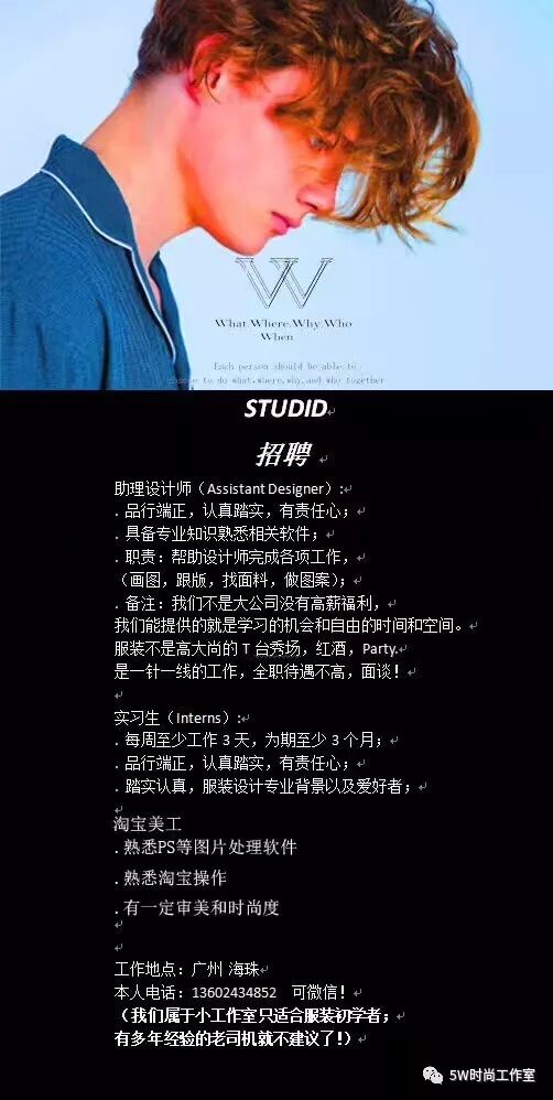 联系方式:13602434852 (手机。微信)公众号:5W时尚工作室
