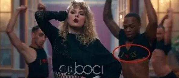 伴舞脱下外套,衣服上映着:I❤TS,让人联想到抖森曾穿过的那件白T恤。