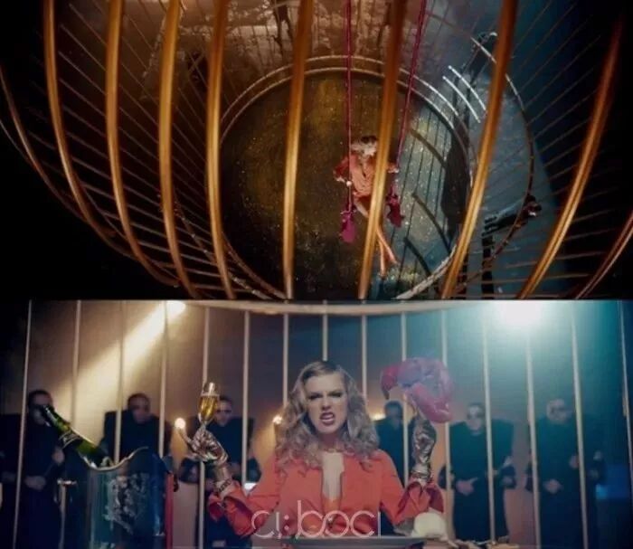 泰勒被关在一个巨大的金色笼子里,荡着秋千,四周站满了保镖。虽然看似生活奢侈,但她只能在一个巨大的笼子里活动,被外面一圈全副武装的人严防死守没有自由。