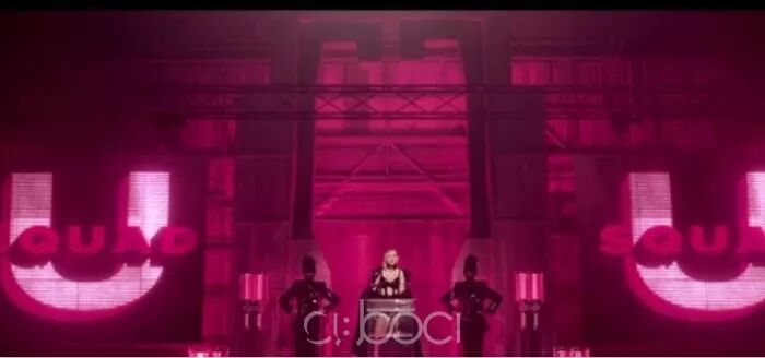 泰勒站在舞台中央,两边屏幕上写着“squad”,台下是宛若假人的一群美女,这是指媒体总爱讽刺泰勒的姐妹团