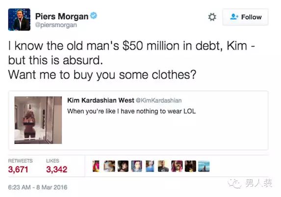 “我听说过,你爸借了5000万美元的债。但是你这么干就太不讲究了吧,卡戴珊,需要我送你几件衣服吗?”