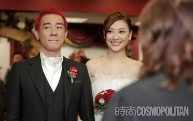 婚礼上的陈小春,一头红发,象征着婚礼的喜庆。看着美丽的新娘在父亲的搀扶下款款朝自己走来,早已泣不成声。