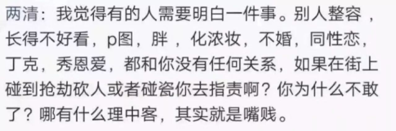 我觉得有的人需要明白一件事。别人整容,长得不好看,p图,胖,化浓妆,不婚,同性恋,丁克,秀恩爱,都和你没有任何关系。如果在街上碰到抢劫砍人或者碰瓷你去指责啊?你为什么不敢了?哪有什么理中客,其实就是嘴贱。