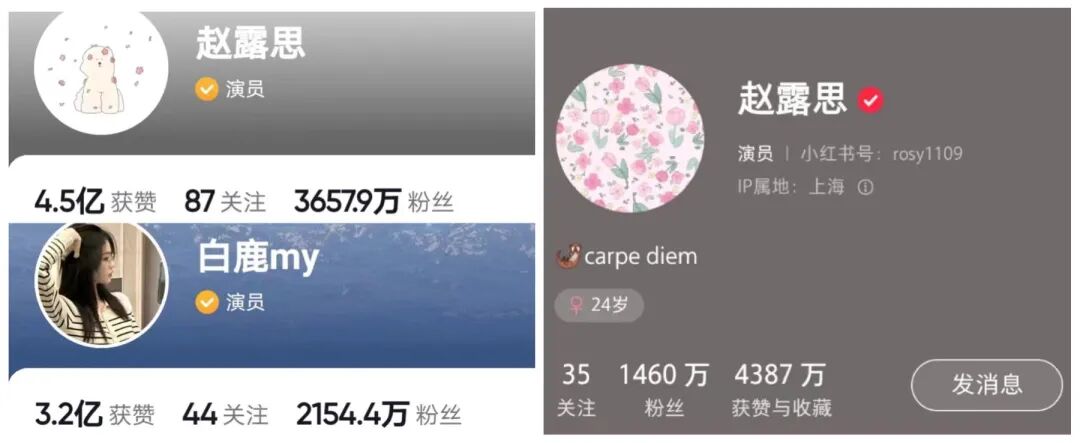 而赵露思、白鹿这两位原本就带有“网红属性”的小花,早年间就在各大社交平台积累了一定数量的粉丝。现在两人在抖音分别拥有3657万和2154万粉丝,赵露思在小红书的粉丝也接近1500万,抛开明星这一身份,也是名副其实的KOL。一定程度上,在更广泛的市场中打开了知名度。