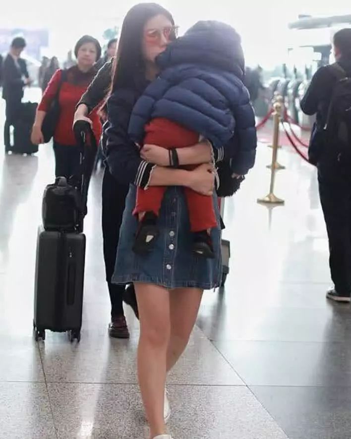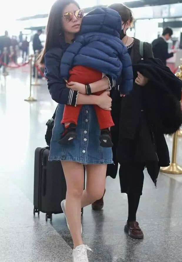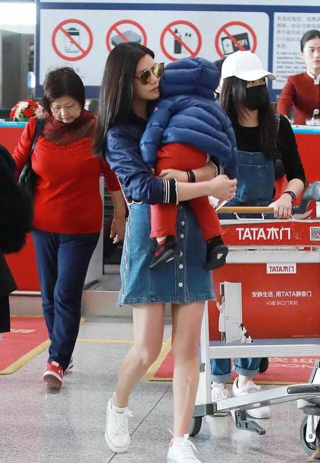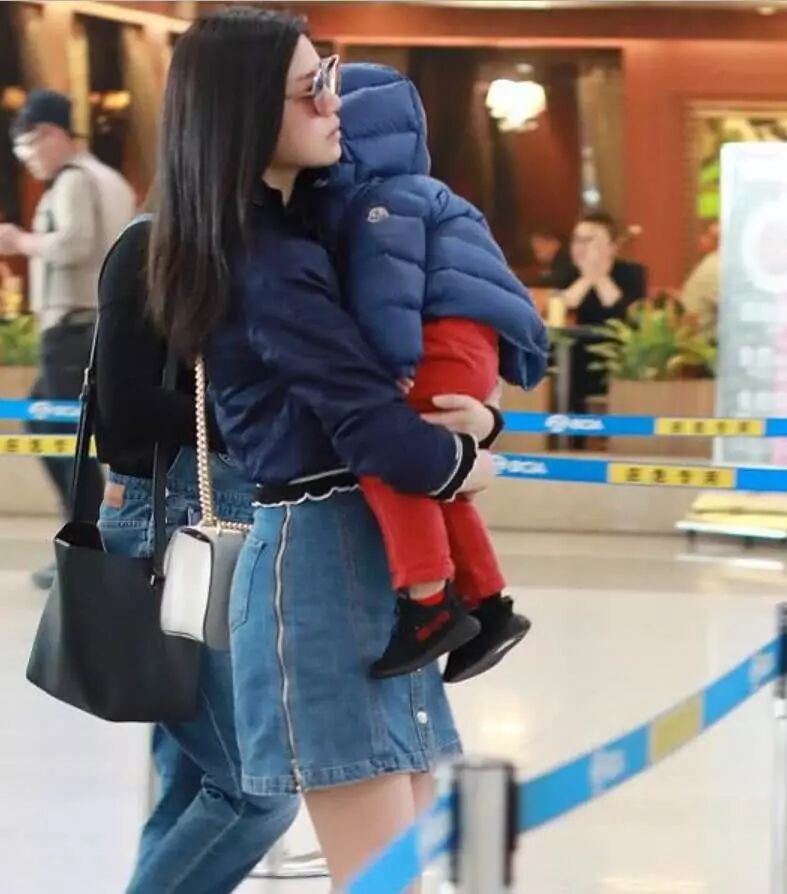 她身穿牛仔裙,造型清爽可人,小星星身穿保暖的羽绒服,趴在妈妈肩头一路酣睡,可爱似树袋熊。陈妍希全程抱着儿子,助理帮忙拿行李。