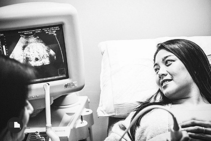 照片中廖碧儿躺在床上接受“产检”,她一只手轻轻地搭在肚子上,看着左边B超仪器显示屏上的照片,面对微笑尽显母爱。