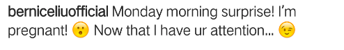 她在下方配文“星期一早上的惊喜,我怀孕了!”这句话配上这张照片,很难不让人多想,许多网友也被廖碧儿的突然官宣所吓到,在评论里恭喜她当妈妈。