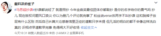 但最让人可气的是,他在凌晨12点发博致谢一些相关人的时候,却只字未提关于Rap词的创造者顽童,难道连最基本的尊重原作者都不会吗?难道偶像的努力真的是用在了抄袭上?