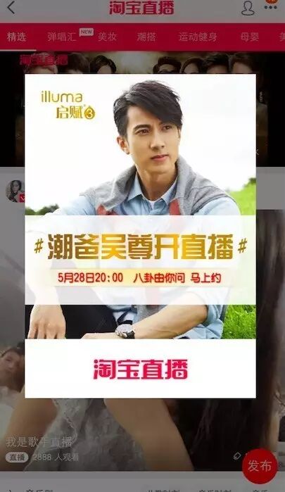 5月28日晚上8点,吴尊开始了一个小时的直播,其目的除了与粉丝互动之外,还有一项任务,就是通过直播,为“惠氏启赋”奶粉做宣传。这次的直播在美拍和淘宝直播双平台同时进行,并且还登上了淘宝直播的推荐首页。