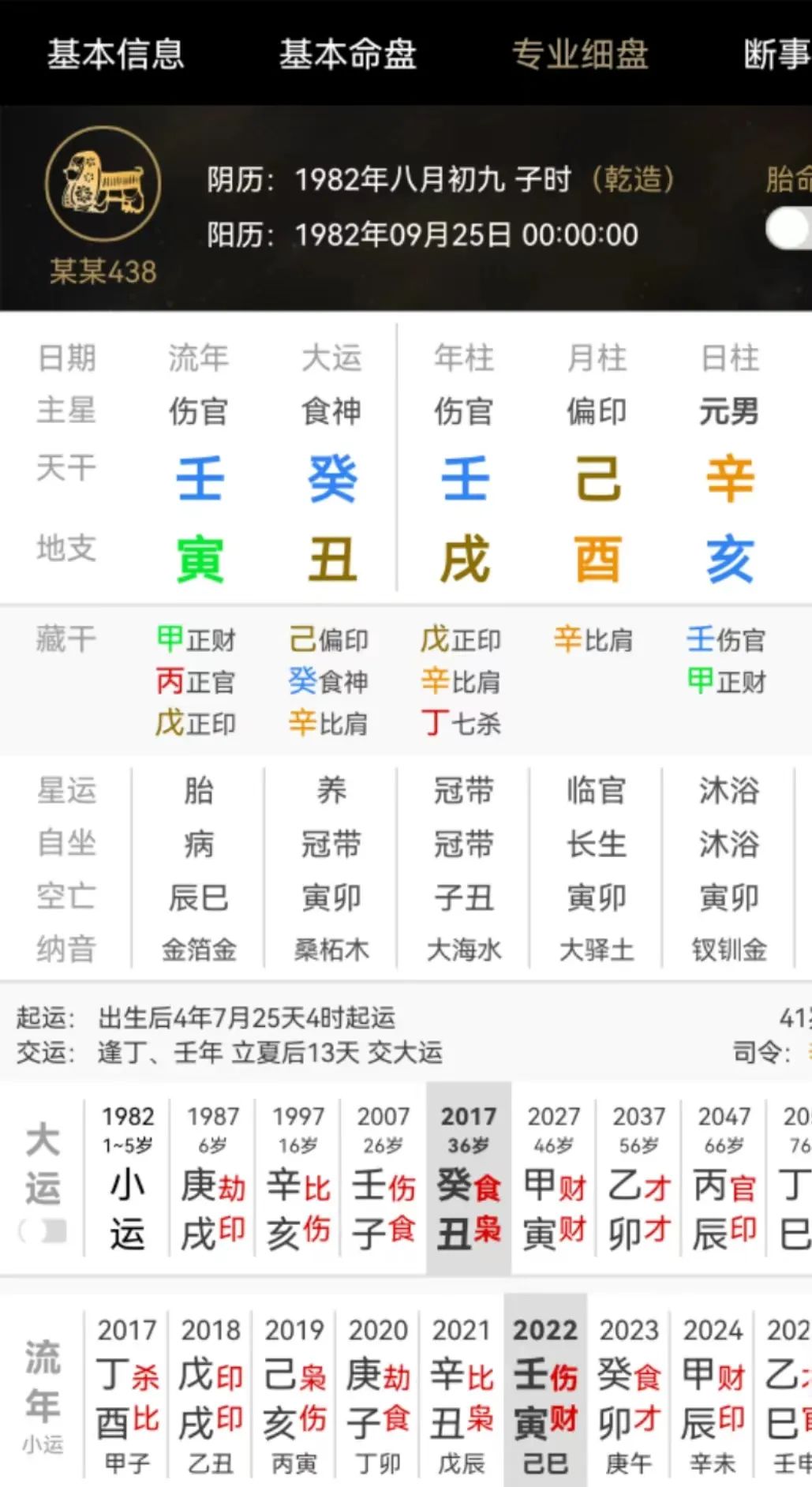 我们大致看下他的大运和流年来分析一下他的运势路线,2001年考上大学,所以差不多实在1997年开始准备走到亥运,也就是伤官运势,但是仍然在大一的时候还是有在走辛的运,所以刚开始并没有太好的成绩。