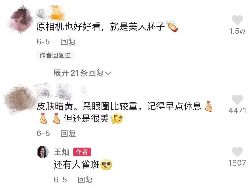 粉丝们都在夸王灿原相机也好看,王灿却自黑说自己还有大雀斑,王灿真实的性格很讨喜了。