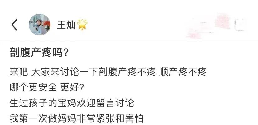 王灿在即将临产之际压力很大,一天凌晨1点多她还上网询问网友,剖腹产和顺产哪个比较疼,王灿表示自己第一次做妈妈,非常紧张和害怕。