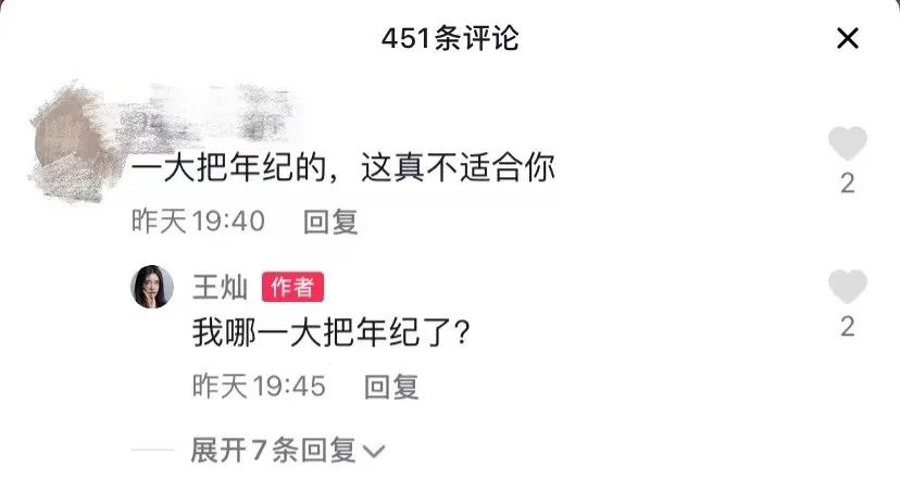 但仍有部分网友不买账,直接评论王灿一把年纪卖萌不适合,王灿倒也直爽回复说自己哪儿大把年纪了。