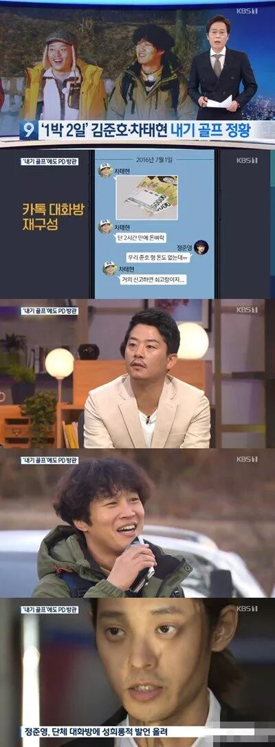 3月16日晚,KBS曝光了包括郑俊英在内的<2天1夜>成员聊天群的对话,根据对话显示,知名演员车太贤、电视人金俊浩等均涉嫌数百万韩元的非法"高尔夫赌博"