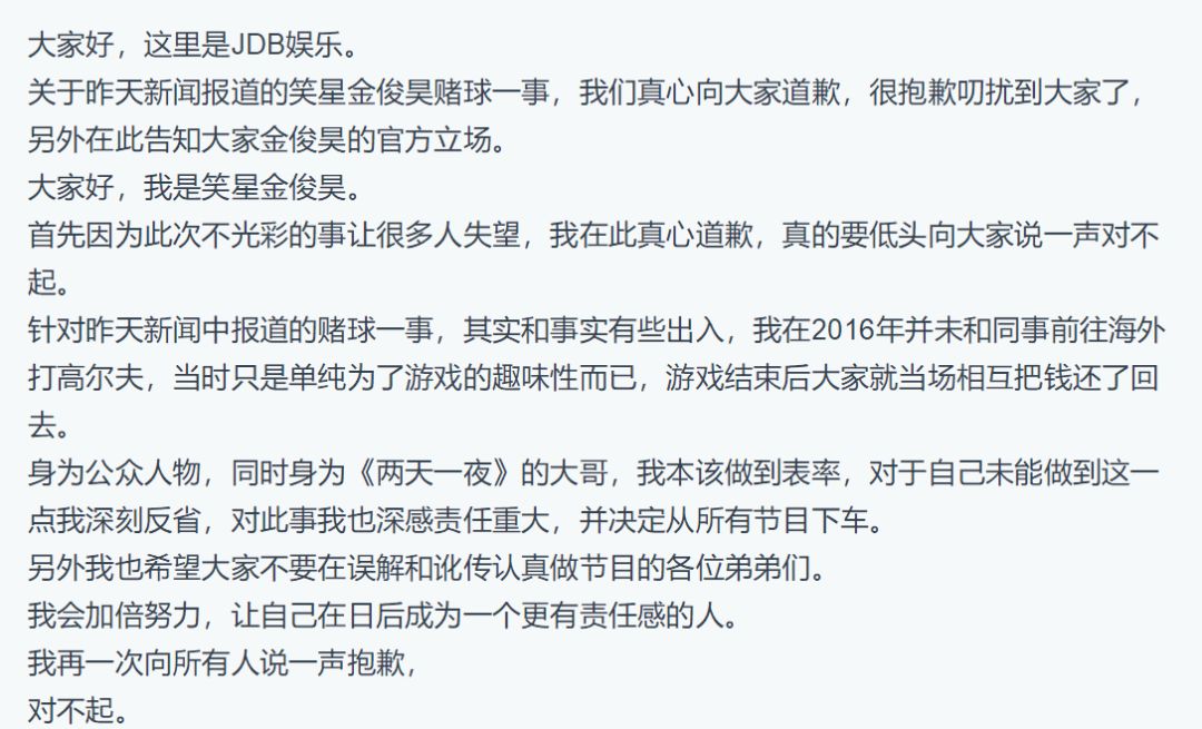 另外,金俊浩通过经纪公司JDB娱乐发布通稿,对引发舆论争议的赌球风波作出正式道歉,并在解释清问题后表示将从所有节目下车,全文如下: