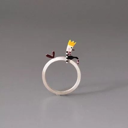 搪瓷造的小孩坐在戒指圆环上,像是在上面玩耍嬉戏,这种童趣快乐特别的让人心生愉悦感。旁边加衬了一个小红心也格外醒目不单调。