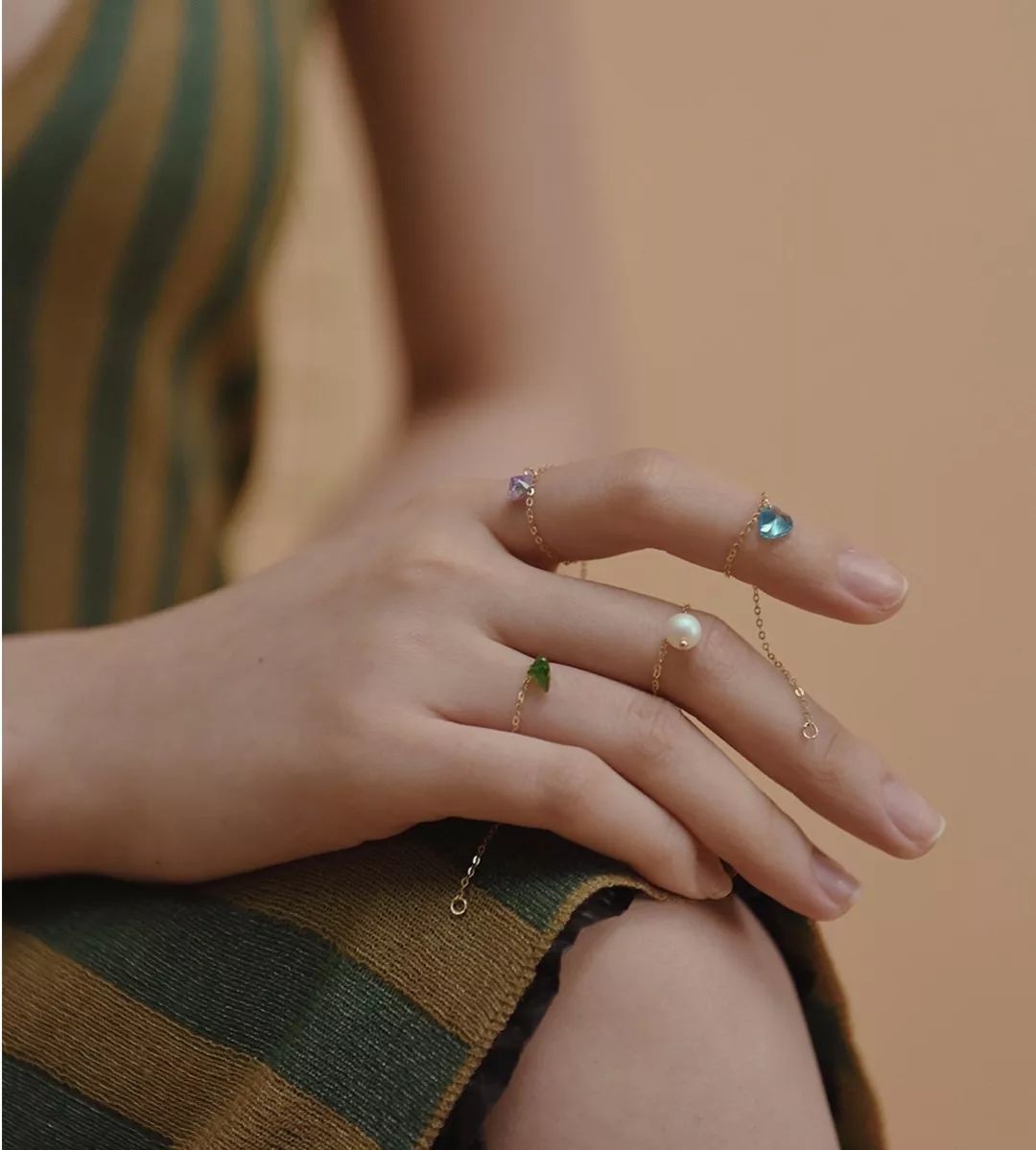 像手链一样的抽绳戒也是美得让人心醉。用了不同的珍珠和宝石作为装饰,精致感满分。而且还可以自由调节,多余的链条坠在指间更添女人味。