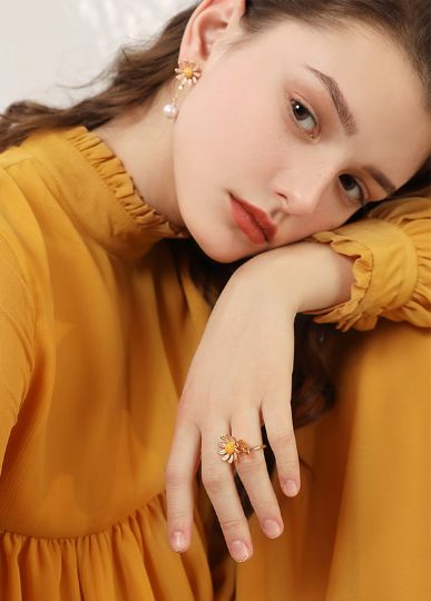 要说更有夏日感的,应该就是这一款了。小雏菊清新而淡雅,黄色点缀着古铜色,有夏日的朝气蓬勃,和满满的少女感。把它戴起来,就像盛开在指间的花朵一样,格外惹人注目。