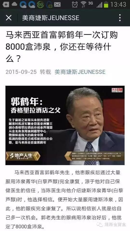马来西亚首富--郭鹤年(香格里拉酒店之父)一次订购8000盒沛泉菁华。