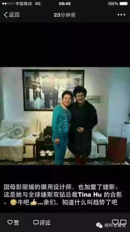 国母彭丽媛的御用设计师,也是婕斯的会员。下图是她与婕斯环球双钻总裁Tina Hu 的合影。