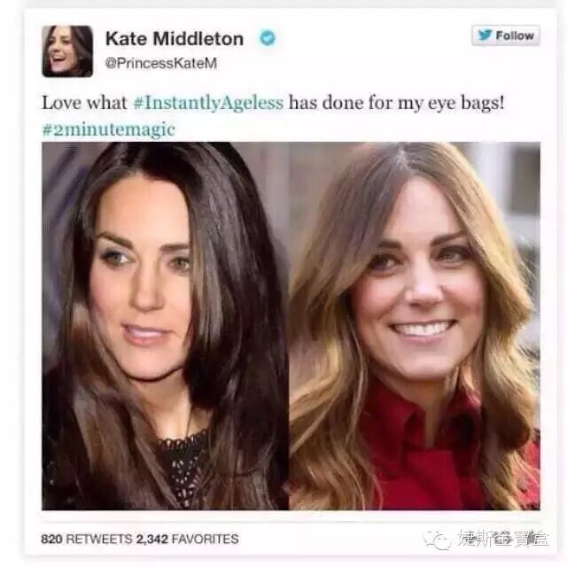 凯特王妃在Twitter上说:“爱死这个instantlyAgeless的去眼袋产品了,它让我的眼袋在2分钟后消失!” 婕斯的产品太强大了