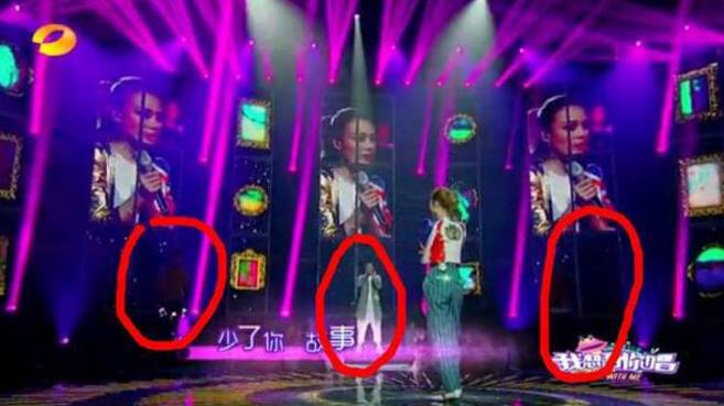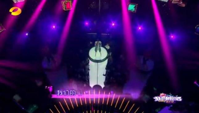 三位选手都站在一个圆柱子上唱歌,轮到谁唱谁的灯光就会亮。