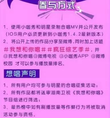 节目规则通俗易懂,最吸引人的点无非是台网联动和星素合唱。所有观众和粉丝都可以通过APP参与互动,参与感是这个节目的一大优势。而APP也可以借此得到很好的合作推广,某APP中每首歌曲就差不多有上万首网友上传合唱作品。