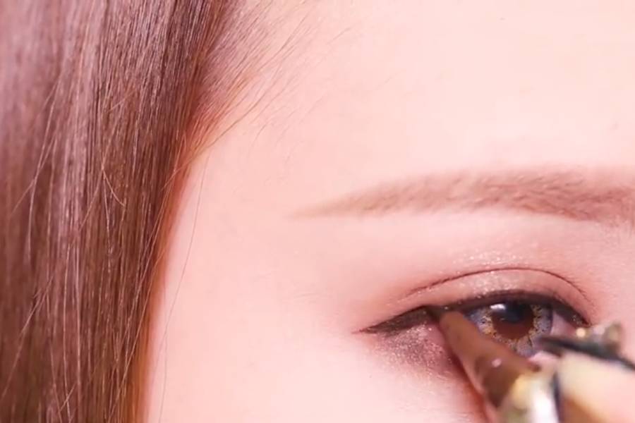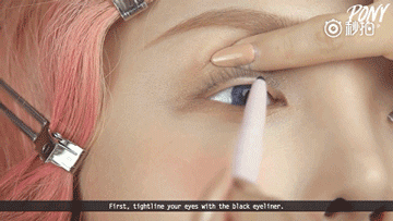 ▲STEP1斜拿眼线笔,贴着睫毛根部,从眼头一点点填充到眼尾。如果你是油皮,在画眼线前可以用眼影为上眼皮薄薄打底。