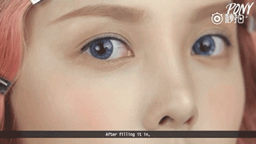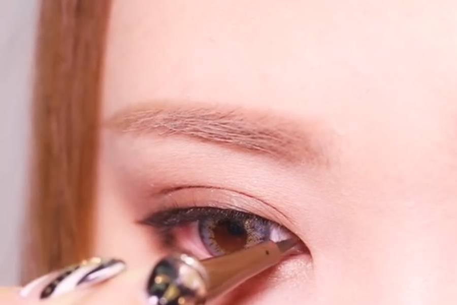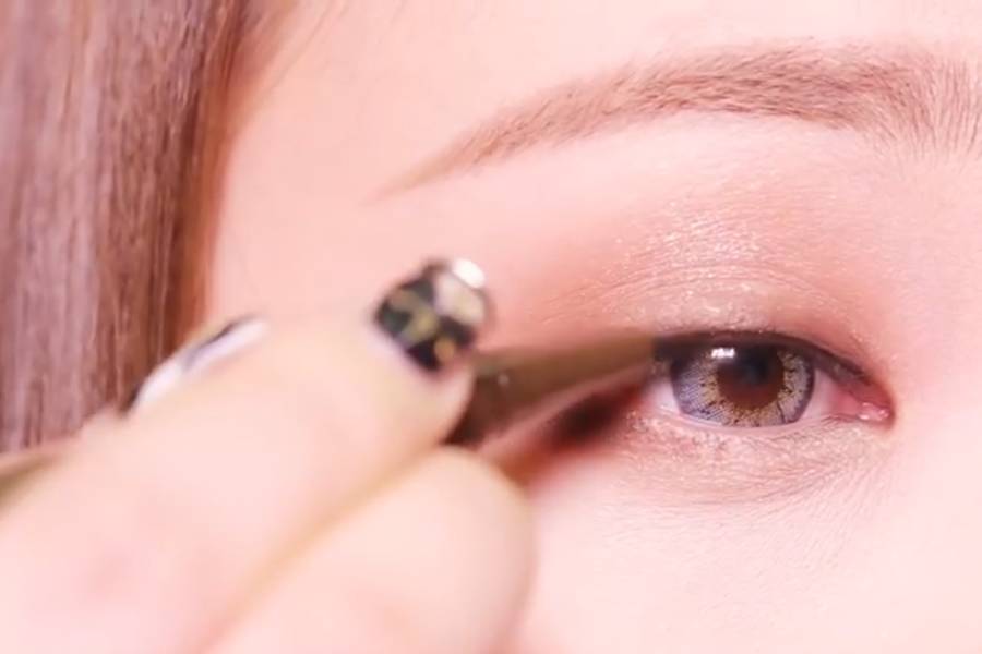 ▲小拇指按压眼皮将睫毛根部翻出,眼线笔从眼头向眼尾慢慢填充,眼尾部分不好上色可以逆向描画。