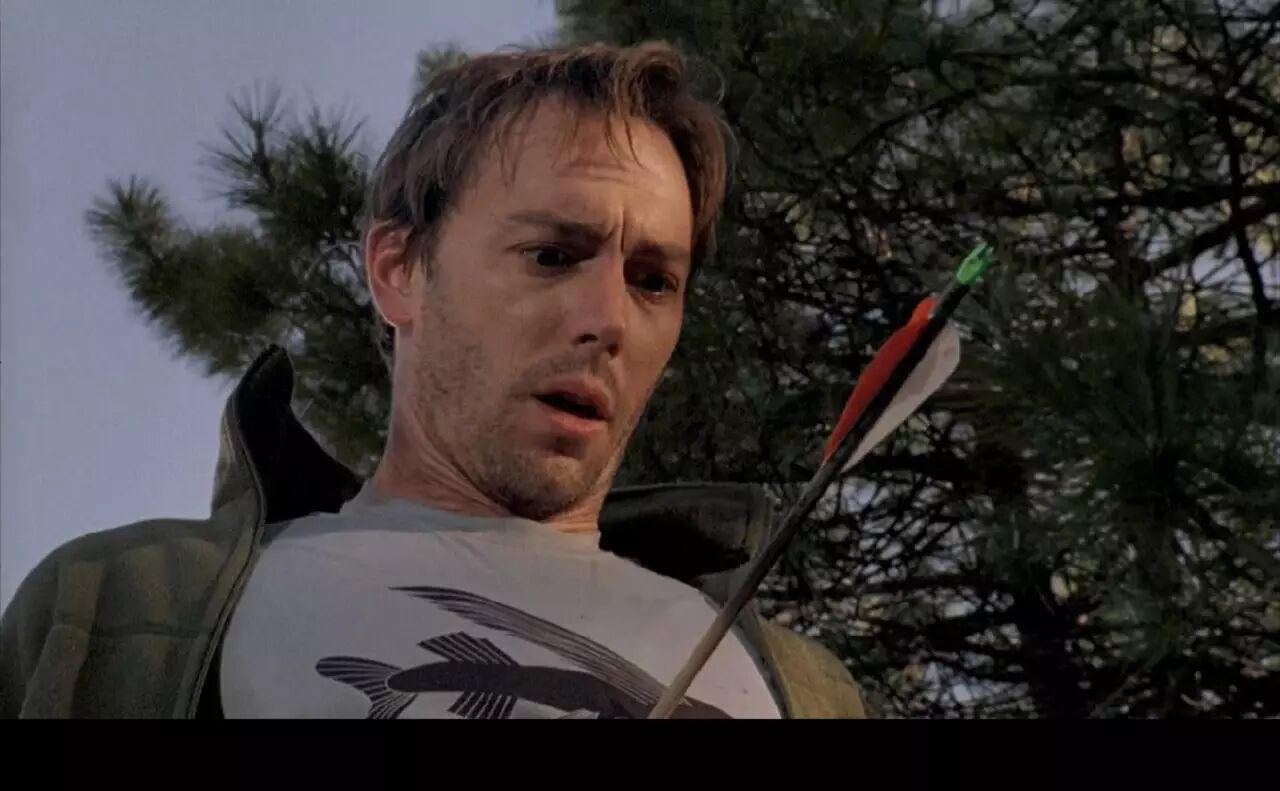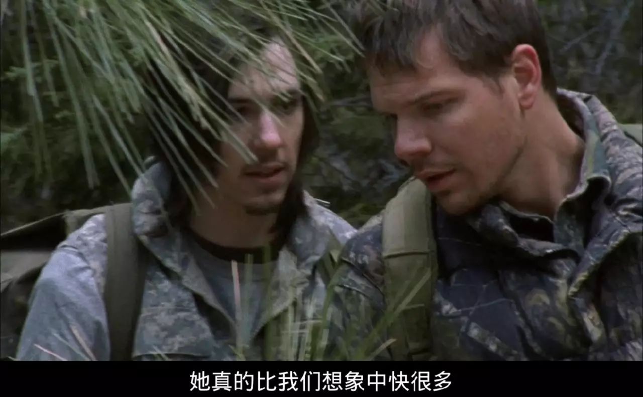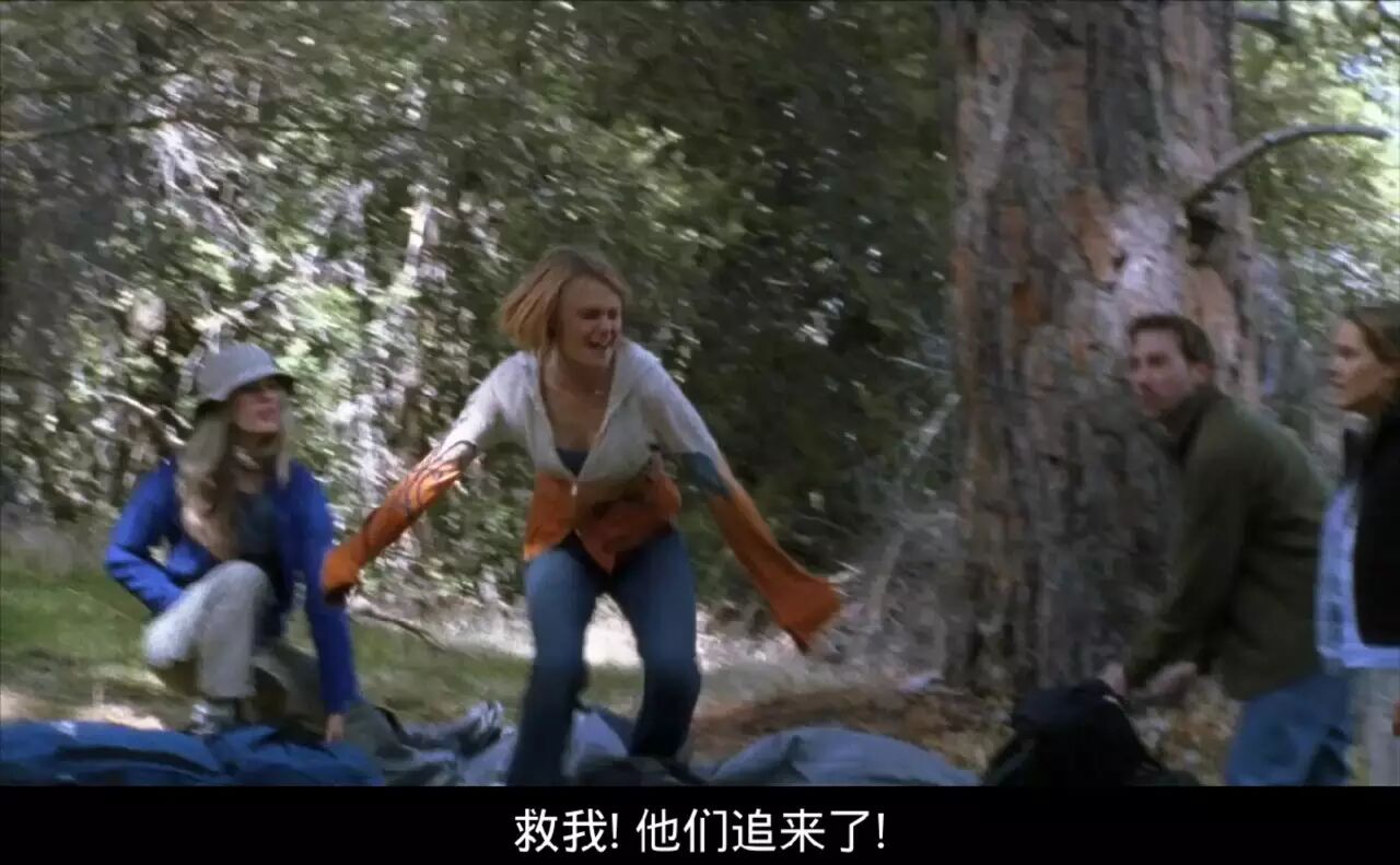 ▲ 两对夫妻在林子里宿营,女主恰好朝着他们的方向跑来,一边跑一边呼救,甚至还没有人弄清楚发生了什么,就有两个人被射杀了,一箭穿胸,剩下两个人也跟着女主一起开启了仓惶逃命模式。