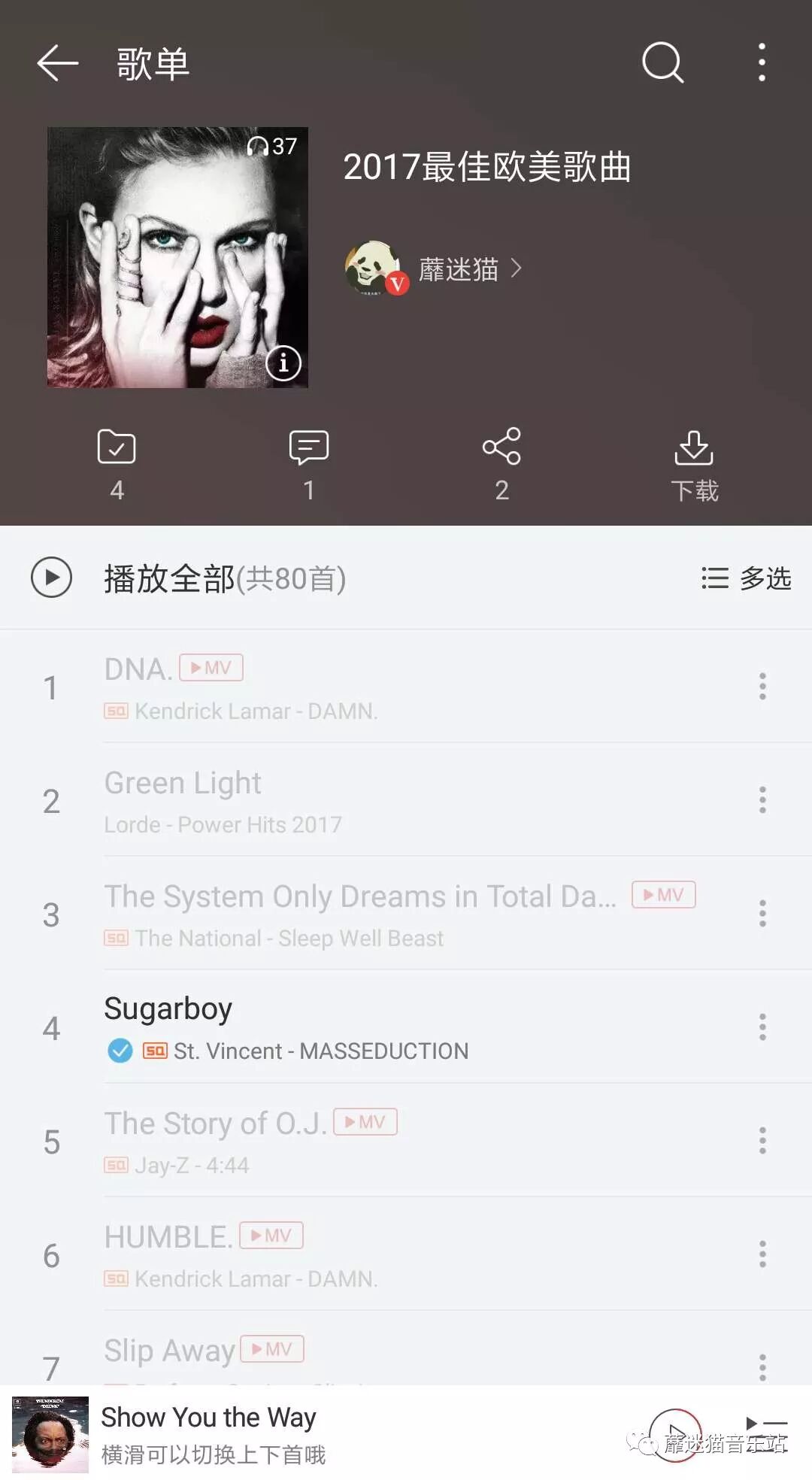 但从今年欧美乐坛的整体情况来看,2017确实是名副其实的小年,撸主在整理年终名单时甚至发现凑出100首优秀的单曲都有些困难,但撸主觉得底线还是要守住,没那么多好歌,就索性削减到80首咯。当然,冠单并不意味着就是质量保证,像前面说到的《Shape Of You》和《Despacito》这样的歌曲,熟悉撸主的朋友都知道,它们肯定不会出现在这个榜单里。像往年一样,今年“蘼迷猫音乐站”依然为大家整理出2017年最优秀的欧美歌曲List,入选作品囊括了流行、摇滚、电子、独立、R&B、说唱、实验、民谣等诸多音乐类型。