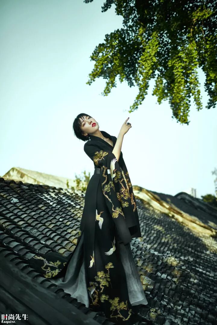 MOMO:其实这次拍的每一套我都真心非常喜欢,造型和衣着的质感都很高端,很简单很时尚,融合了中国民族的元素。一定要说一套的话,就是有一套是坐在房顶屋檐上,戴了那种古代的斗笠,然后手臂上有刺绣的装饰,其他的衣着很简单,是黑色的,但我觉得很有侠女的感觉,很有气势,个人感觉也很简单很舒适。