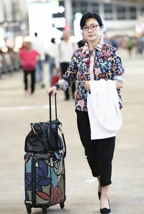 这件身搭配就有点偏向于老年化了,这种碎花图案的上衣一直都中老年妇女的最爱,而且穿这种衣服特别显老。好在周涛的气质和气场完全压制出了这件难以驾驭的碎花上衣。下身,黑色九分裤和黑色中跟绒面鞋子的搭配也算是中规中矩。