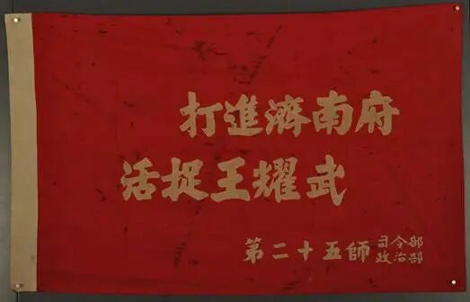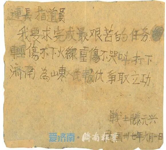 “滕元兴请战决心书”现收藏于山东省济南市博物馆,这是一张微微有些发黄的白纸,上面有滕元兴用蓝色墨水写的豪言壮语:“连长、指导员:我要求完成最艰苦的任务,轻伤不下火线,重伤不哭叫,打下济南为山东人民报仇,争取立功。战士滕元兴。民国三十七年九月一日。”这封决心书,字迹工整、方方正正,个别地方带有血迹、泪水斑痕,字里行间是一名年轻战士的坚毅和信念。滕元兴是“济南第一团”登城的第三名战士,这是他在战前向党支部写的请战决心书,上面还有用血按上的手印。