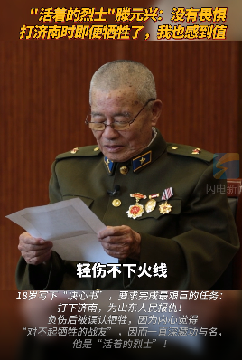 在这场战役中,滕元兴荣立一等功,华野九纵七十三团也被授予“济南第一团”的光荣称号。此后,滕元兴一直用实际行动践行着决心书上的每一个字。解放后,他成为新中国的第一批飞行员,在抗美援朝战争中又创造了辉煌的战绩。如今,距离那段壮烈的战役已经过去了七十年之久,滕元兴已是一位耄耋之年的老人。当老人再次回忆起当年的战斗经过,眼角的热泪在苍老的双手中滚滚落下,91岁高龄的滕老先生再次提笔,写下了一首用一生谱写的奋斗之歌:“亲爱的党组织:是党改变了我的一生,英勇顽强,敢打胜仗,就是党组织教会我的。山河犹在,国泰民安,这是一个更好的中国!”滕元兴用一生戎马践行了对党、对国家的诺言,昭示着一位老共产党员的不变初心。