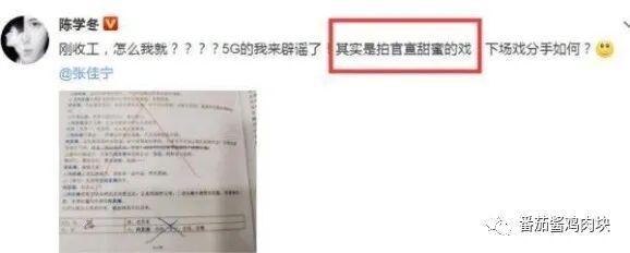 但是随后的陈学冬也是立马就辟谣了。并且还晒出了剧本的一张截图,原来这场戏他正是和张佳宁一起拍摄的,并且两个人手牵手也是因为剧中剧情的一个需要,在剧中陈学冬饰演的就是一个大明星,为了让这个女孩儿拥有安全感,所以就拉到人群里边,并且直接向大众宣布这就是我的女朋友。