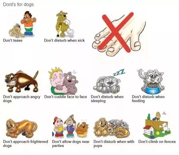不要让孩子捉弄或者围堵爱犬,也不要让他们抱住狗的脖子;教导孩子什么时候不要去打扰爱犬,比方说狗狗睡觉或者喂养犬崽的时候;训练并且多多观察爱犬,了解它们的行为举止。