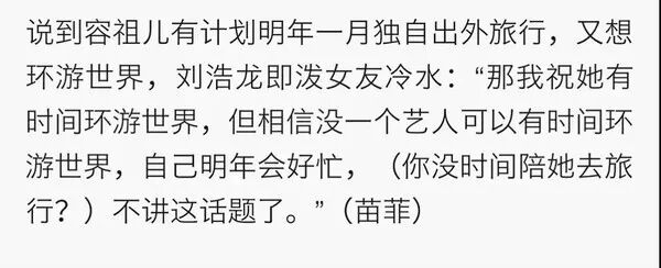 不过这还不算完,刘浩龙似乎对容祖儿心有不满,多次在采访中暗中呛声。祖儿表示自己计划明年外出旅行,想环游世界。刘浩龙就在采访中表示,做艺人没有时间可以环游世界。