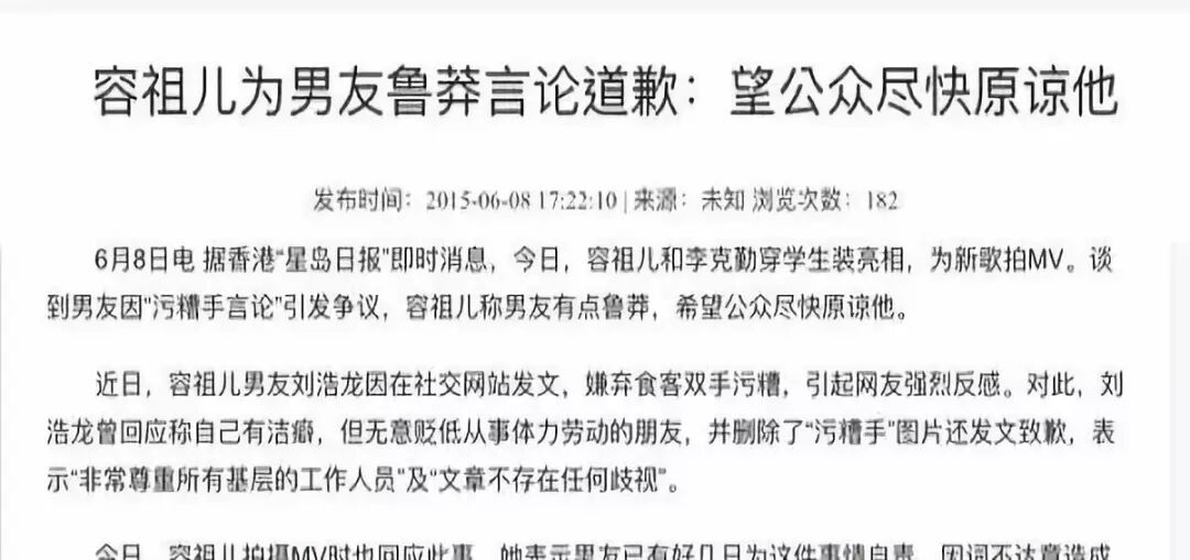 不光祖儿妈妈反对,刘浩龙的人品更是被网友质疑,之前刘浩龙在吃饭时看到邻桌食客的手嫌不够干净,便在网络发泄自己的不满,并且配上了一张劳动者的手,被网友质疑是否歧视劳动者。