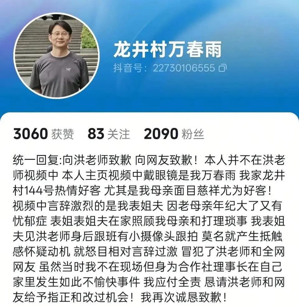 声明中,万春雨首先向洪老师深深致歉,又向广大网友表达了歉意。他解释说,自己当时并不在现场,视频里言辞激烈的是他的表姐夫。
