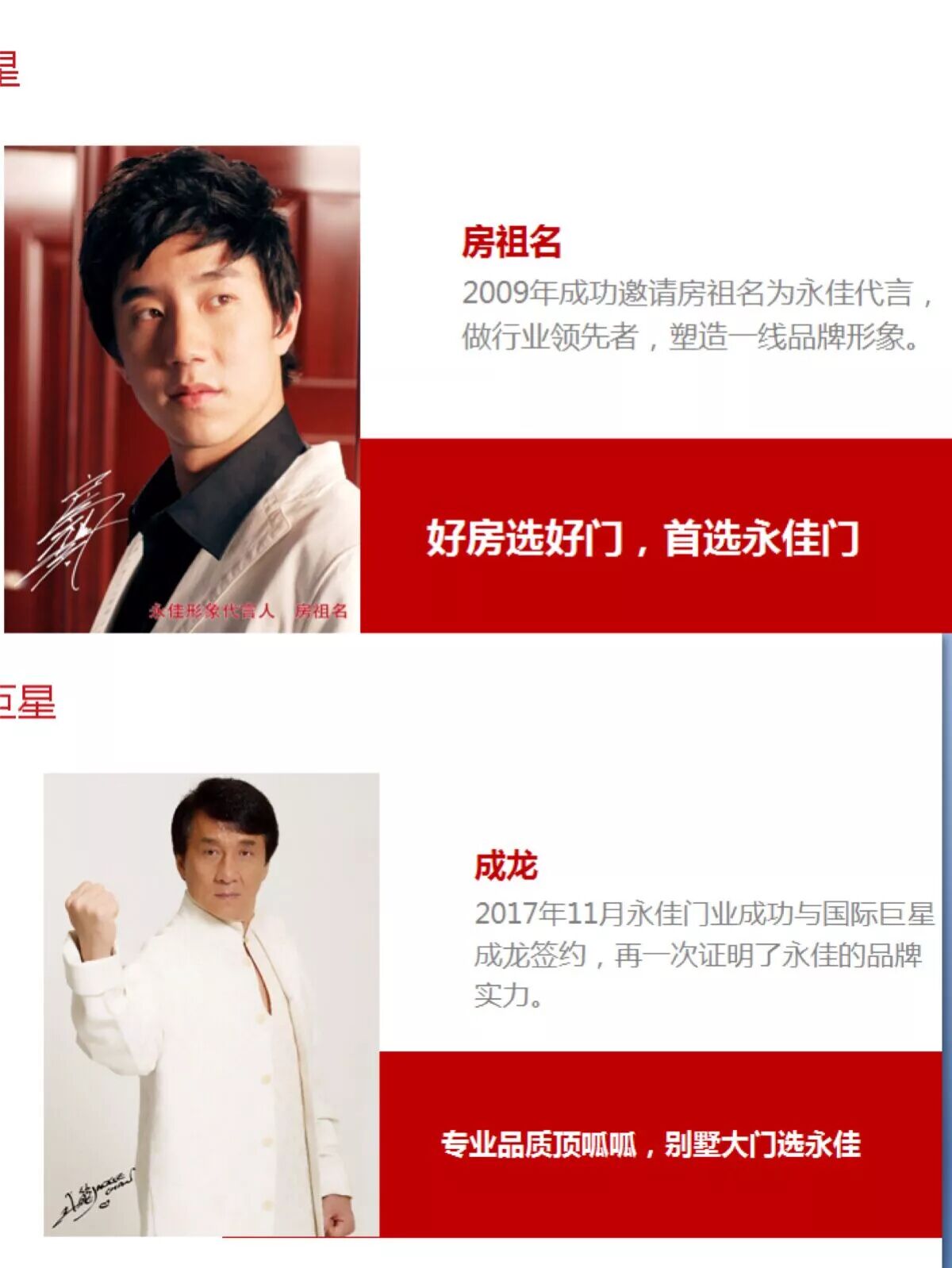 热烈祝贺,永佳门业继09年房祖名后,又签约国际巨星成龙! 门业资讯 港台男星 2017-11-06 09:20:44 305 创作不易,用心坚持,欢迎请BaGua喝几杯爱心咖啡!打赏并支持本文 打赏并删除本文 热烈祝贺,永佳门业继09年房祖名后,又签约国际巨星成龙,助力打造门业多品类强势品牌永佳门业是15年的老牌企业,产品涵盖别墅门,强化门,钢木门,木门,家居整装,各大领域都有非常优秀的表现招商热线15257998899...赞一个 老板说工资加50元有兴趣了解的经销商,右下角留言! 创作不易,用心坚持,欢迎请BaGua喝几杯爱心咖啡!打赏并支持本文 打赏并删除本文 感谢您的支持鼓励,我会继续努力的!文章地址:用户邮箱:打赏金额:USDT 请输入数字点击”去打赏“,即可进行打赏支持本文章哦 房祖名 About the Author 门业资讯 功能介绍:1.发布门窗行业的最新、最热的资讯 2.为门窗经销商提供最新的门窗产品信息 3.为门窗厂家提供各种产品信息的发布平台 4.为长期在外创业打拼的江西老乡发布家乡的一些重大事件及地方发展动态。 Related Posts 热烈祝贺,永佳门业继09年房祖名后,又签约国际巨星成龙! 2017-11-06 09:20:44 发表评论